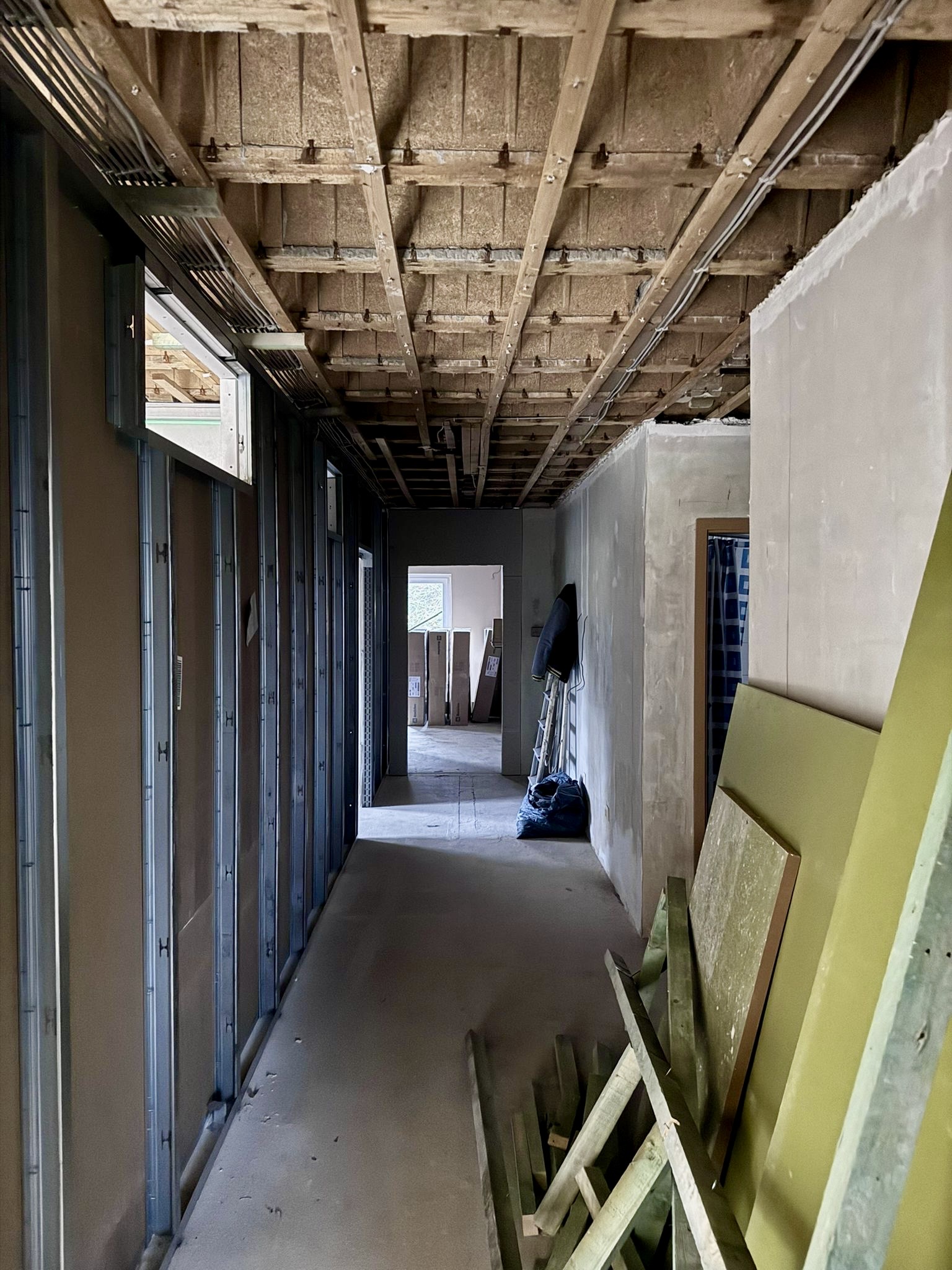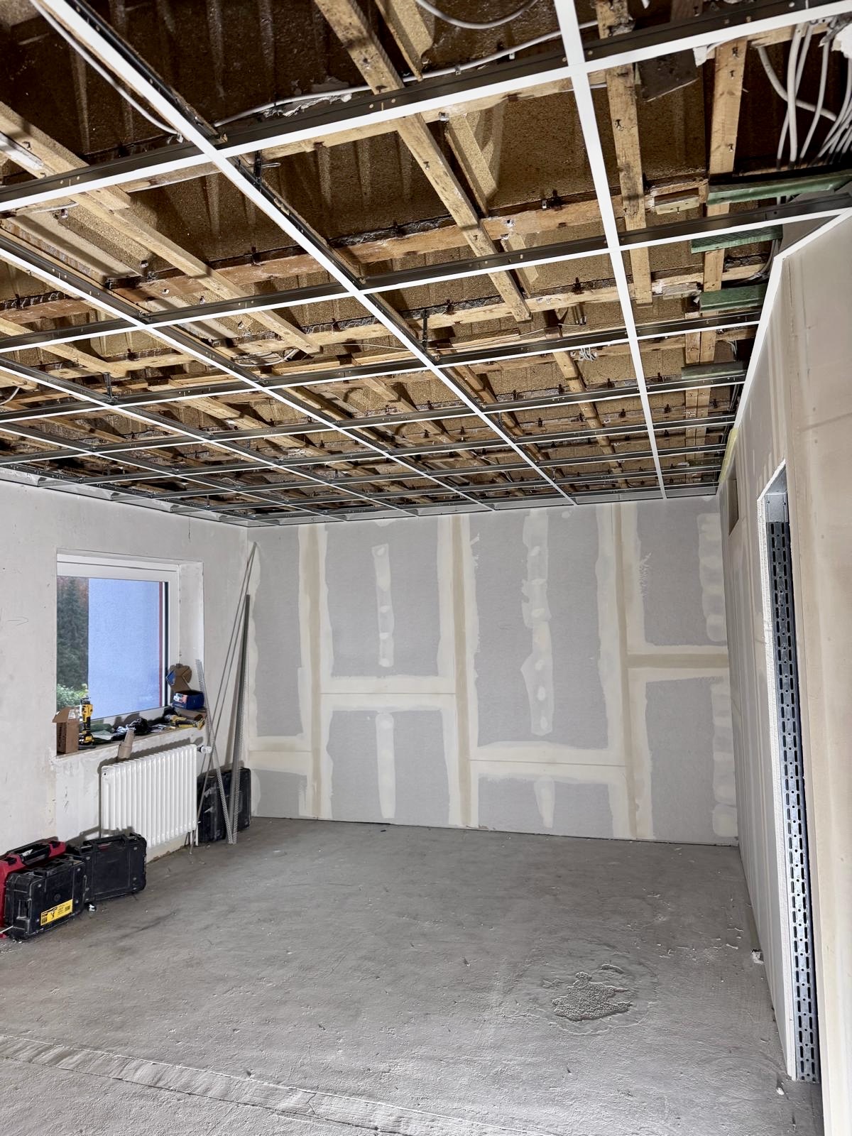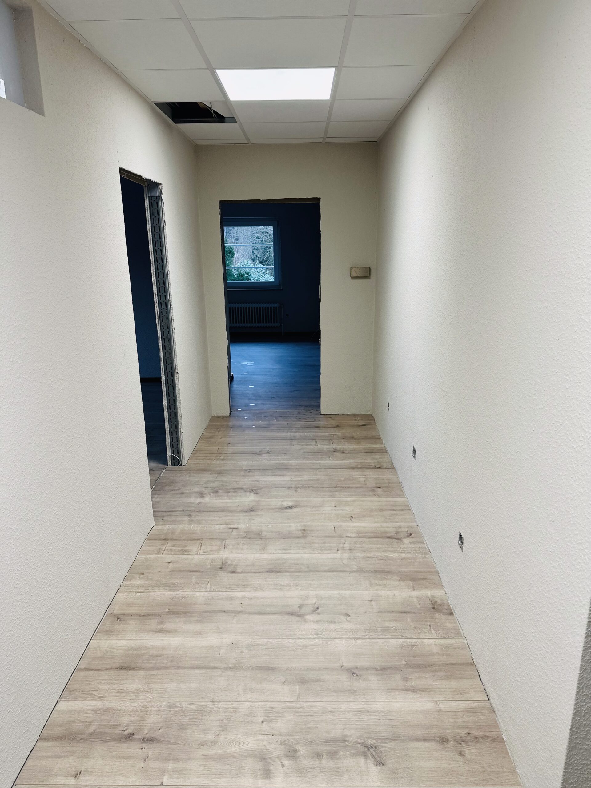 Am 19.11.2024 waren die Trockenbauer schon so weit, dass die ersten Räume bereits entstanden waren. Auch die Decke musste komplett abgehangen werden. Weiter ging es dann mit den Wänden, die neu tapeziert und gestrichen werden mussten. Zwischendurch musste die komplette Netzwerkinfrastruktur und neue Stromleitungen verlegt werden. Mitte Dezember wurde der Boden durch unseren Mitarbeiter verlegt, damit der Umzug pünktlich am 16.12.2024 beginnen konnte.